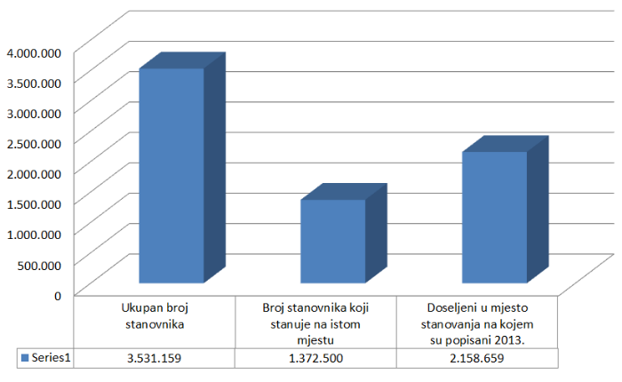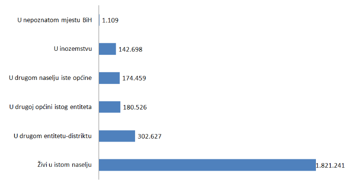 Podaci Agencije za statistiku pokazuju da od ukupnog broja stanovnika, njih 1.372.500 (38,9 posto) stanuje od rođenja u istom mjestu, dok je 2.158.659 (61,1 posto) doseljeno u mjesto stanovanja, u trenutku zadnjeg popisa stanovništva 2013. Od čega 72 posto iz drugog mjesta u BiH i 28 posto iz inozemstva pokazuju podaci Agencije za statistiku BiH.
