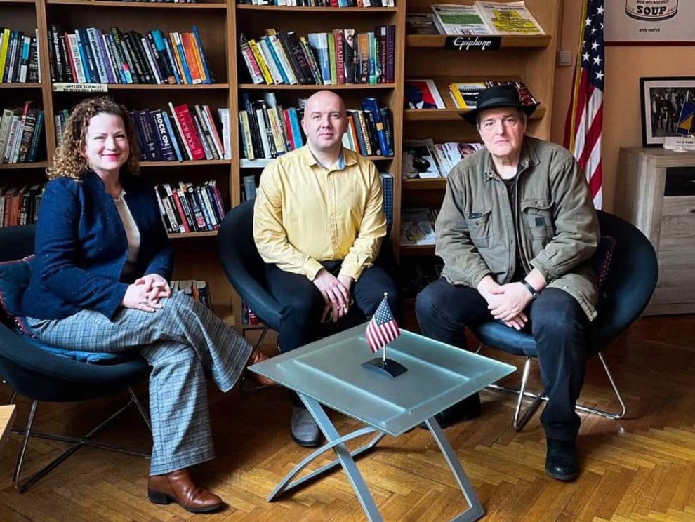 Hennessey u Američkom kutku Biblioteke u Zenici sa direktorom Ormanovićem i rukovodiocem kutka Pašićem