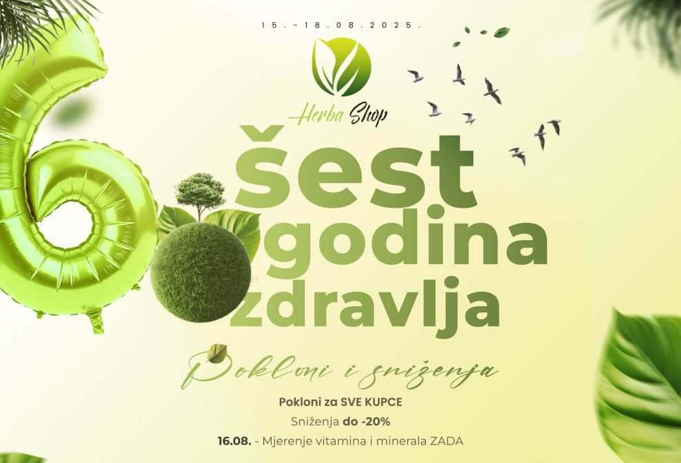 Herba Shop, omiljena destinacija za sve ljubitelje zdravog načina života, ove godine slavi 6. rođendan. Proslava će trajati od 15. do 18.08. u TC FIS Vitez, a posjetitelje očekuju posebni popusti, pokloni i zanimljiva iznenađenja.
