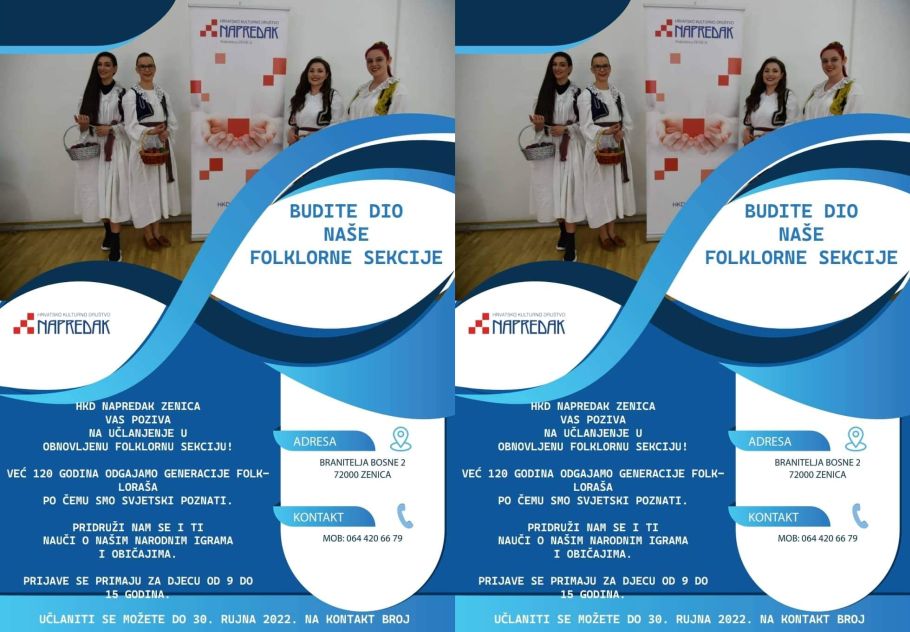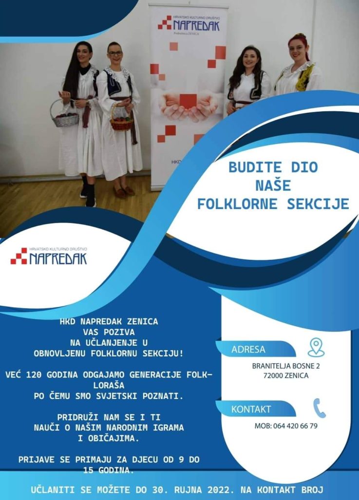 Hrvatsko kulturno društvo “Napredak” Zenica poziva svu djecu starosti od 9 do 15 godina da se učlane u ponovno aktiviranu folklornu sekciju.
