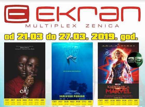 Multiplex „Ekran“ Zenica je za sljedeću filmsku sedmicu svojoj publici spremio itekako atraktivne nove filmske naslove, što je svakako dovoljan razlog da prve proljetne dane provedemo baš u kinu. Od četvrtka, 21. marta u dva termina dnevno počinju projekcije, kako kritika kaže, najboljeg horor filma ikada, filma „MI“, čiji je autor oskarovac Jordan Peele. Fanovi reditelja Davida Roberta Mitchella i njegovog filma To dolazi, napokon su dočekali njegov povratak u modernom neo noir kriminalističkom trileru s Andrewom Garfieldom u glavnoj ulozi. Film „Skrivena poruka“ će publika imati priliku gledati svaki dan od 20:30 sati. Film „Mia i bijeli lav“ je emotivna i topla priča o prijateljstvu i ljubavi između mlade djevojke i bijelog lava, snimana preko tri godine, a upoznaje nas sa njenim nevjerovatnim putovanjem kroz afričke savane kako bi svom najboljem prijatelju našla novi dom. Sve informacije kao i rasporede projekcija u Multiplexu „Ekran“ Zenica možete naći na stranici www.multiplexekran.ba, a ulaznice možete rezervisati na broj telefona 032 407 518, svaki dan poslije 16:00 sati.