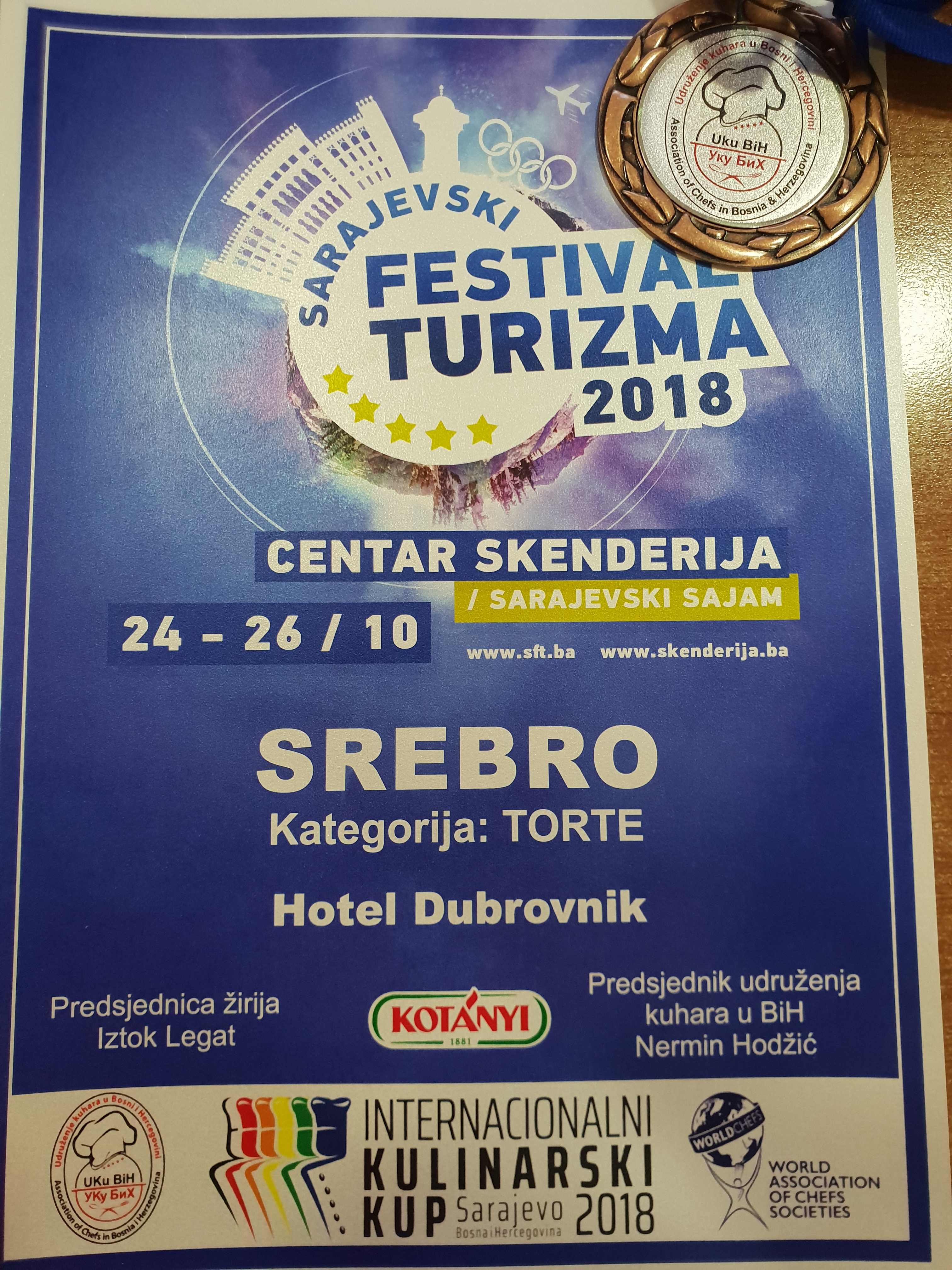 Hotel Dubrovnik dobitnih srebrene medalje na Festivalu turizma u Sarajevu – Na festivalu turizma, koji se održavao u Sarajevu od 24.10.-26.10.2018.godine, hotel Dubrovnik je osvojio srebrenu medalju na Međunarodnom kupu kuhara i poslastičara u kategoriji torte. Predstavili su se sa četiri torte, od kojih je jedna osvojila srebro, dok su ostale dvije ocijenjene sa srebrenom medaljom.