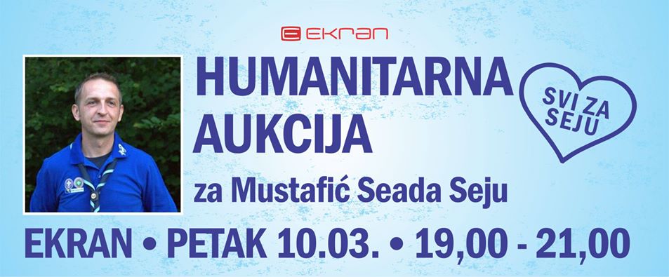 Humanitarna aukcija za Seju – Ekran – petak u 19 sati – Zeničanin Sead Mustafić – Sejo je, nakon što mu je konstatovan težak oblik tumora na mozgu, operisan u „Acibadem“ klinici u Turskoj za šta je bilo potrebno 50.000 KM koje su skupljene i uplaćene na račun te klinike.