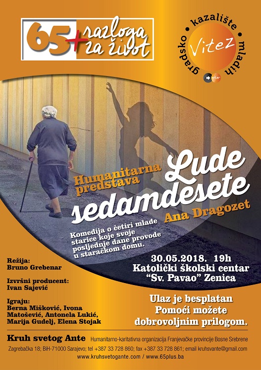 Humanitarna predstava “Lude sedamdesete” u Zenici – Humanitarna predstava “Lude sedamdesete” u izvedbi Gradskog Kazališta Mladih Vitez održat će se 30.5. srijeda u 19h u KŠC „Sv. Pavao“ Zenica, a koja se realizira u okviru kampanje “65+ razloga za život” kojoj je cilj poboljšanje uvjeta života starih osoba u 10 župa/općina u BiH.