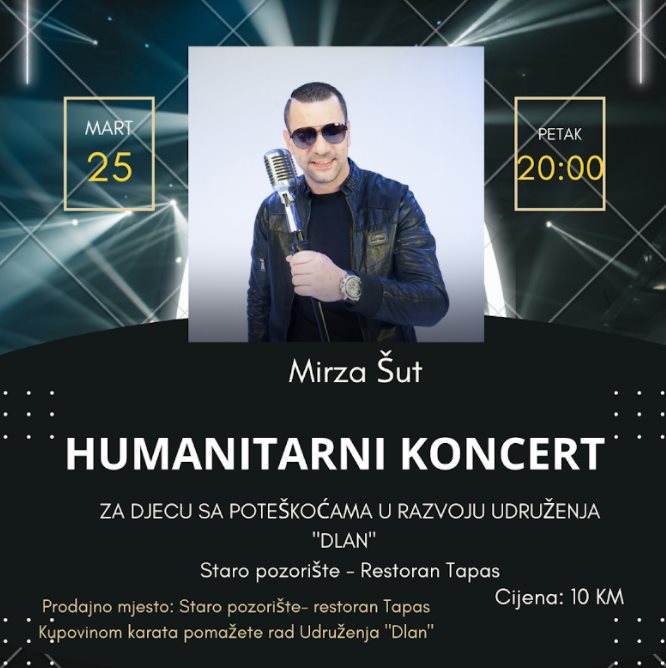 Udruženje „Dlan“ organizator je humanitarnog koncerta koji će se održati 25.3.2022. godine u prostorijama restorana Tapas – Staro pozorište s početkom od 20: 00 sati.