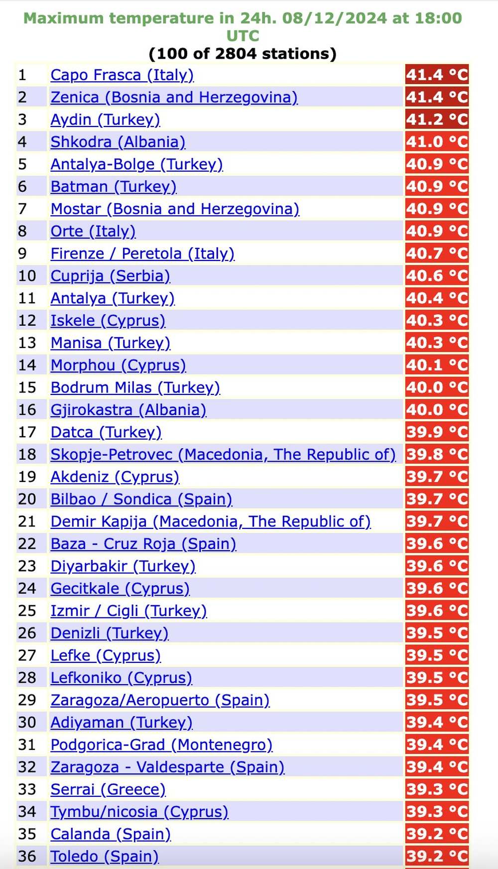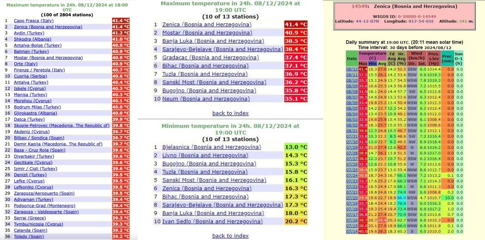 Sa 41.4 °C, Zenica je danas dijelila 1. mjesto sa Capo Frasca u Italiji (Sardinija).