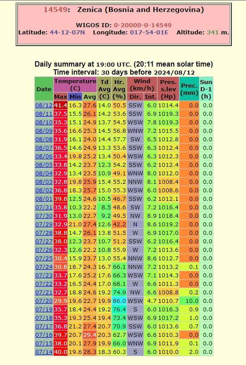 Prema podacima meteorološke stranice Ogimet, Zenica proteklih mjesec dana kontinuirano (osm 20.jula sa 29,9) ima najvišu dnevnu temperaturu iznad 30 stepeni.