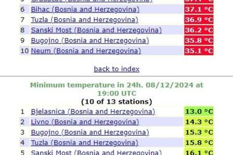 Pogledajte i kako smo “stajali” danas u odnosu na druge gradove u BIH, te kako su mjerene temperature tokom proteklih 30 dana.
