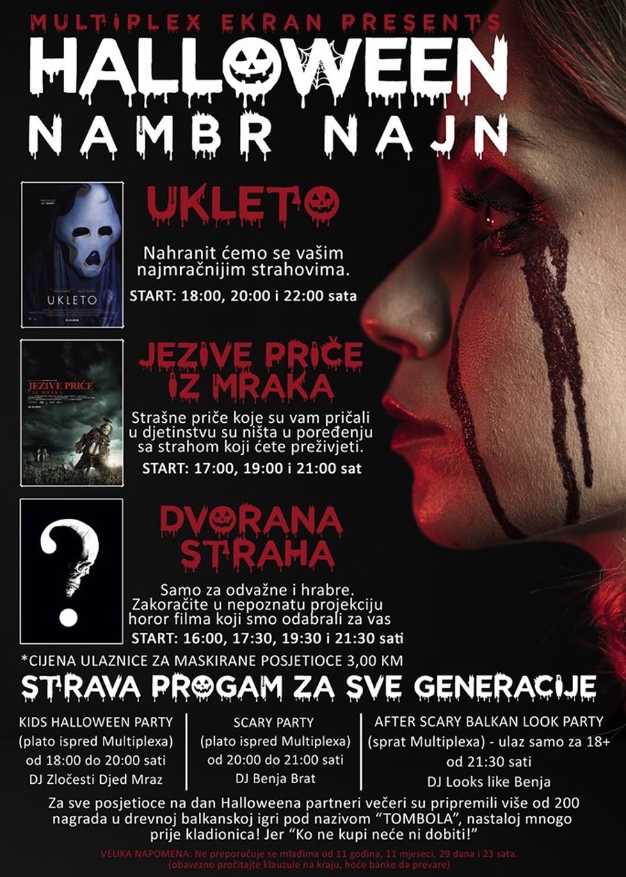 Publika će od 16:00 sati imati priliku gledati ukupno 10 filmskih projekcija, najstrašnijih horora iz prethodne godine po najboljim cijenama, a kao i prethodnih godina za sve maskirane posjetioce ulaznica je simboličnih 3,00 KM. Također, po prvi put u ponudi je i Dvorana straha, projekcija i sadržaj koji publika ne zna do samog početka.