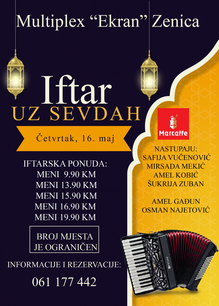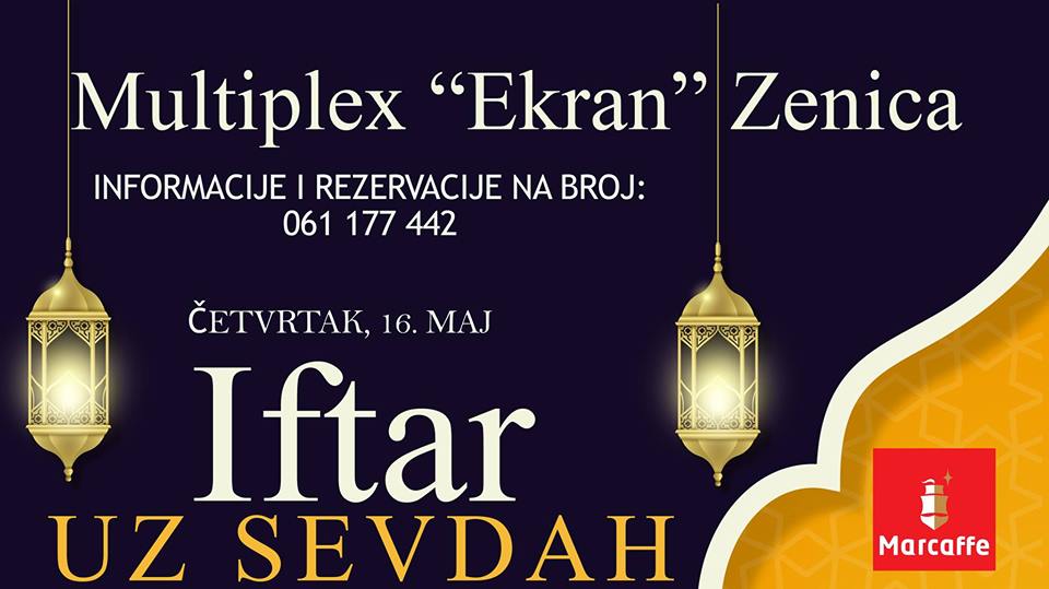 Naime,  prvi Iftar uz sevdah će se održati u četvrtak, 16. maja u Multiplexu “Ekran” Zenica, a svi zainteresovani svoje mjesto mogu rezervisati na broj telefona 061 177 442, te ujedno izabrati jedan od bogatih iftarskih menija Multiplexa “Ekran”.