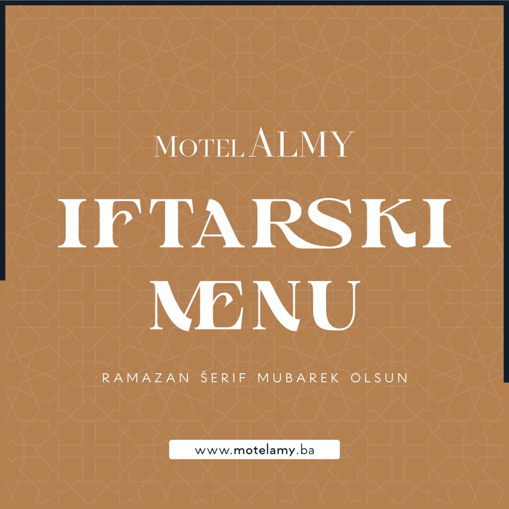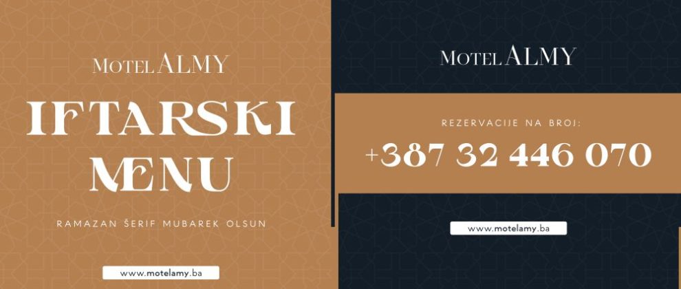 Dragi naši, predstavljamo Vam naš iftarski menu za Ramazan 2024. godine. Dočekajte iftar u prelijepom ramazanskom ambijentu sa svojom porodicom i prijateljima uz specijalno pripremljen iftarski menu. Restoran Almy je klimatiziran, moderno i funkcionalno uređen, te ima kapacitet od 130 sjedećih mjesta. U sklopu Motela Almy nalazi se i besplatni parking za sve goste. Rezervišite Vaš iftar na vrijeme na broj telefona +387 32 446 070. Čekamo Vas na adresi Vrandučka bb, 72000 Zenica. Vaša oaza mira i kulinarskih specijaliteta – Motel Almy!
