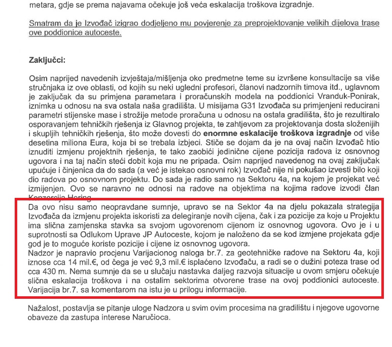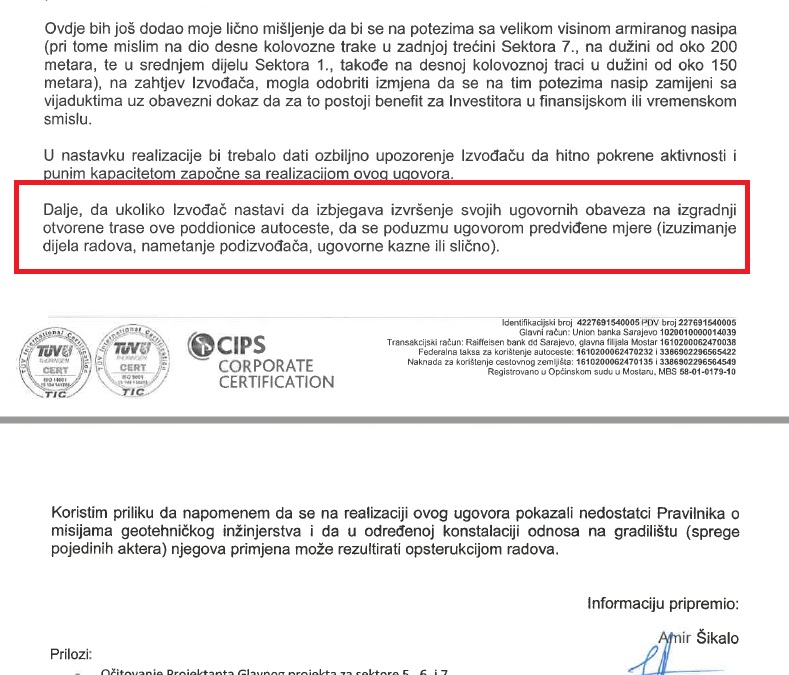 – U misijama G31 (geotehnička izvedbena studija) izvođača primijenjeni su reducirani parametri stijenske mase i strožije metode proračuna u odnosu na ostala gradilišta – to je dovelo od osporavanja rješenja iz glavnog projekta, ali i enormne eskalacije troškova od više desetina miliona eura. Stječe se dojam da je na ovaj način izvođač htio iznuditi izmjenu projektnih rješenja te tako zaobići jedinične cijene pozicija radova iz osnovnog ugovora i na taj način steći dobit koja mu ne pripada. Na to upućuje i činjenica da do sada, a već je istekao osnovni rok, izvođač nije ni pokušao izvesti bilo koji dio radova po osnovnom projektu – upozorava Šikalo u svom aktu prema Upravi Autocesta.