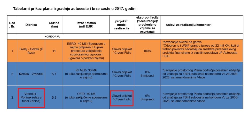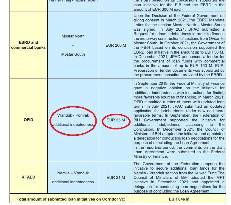 Zanimljivo je, kako se navodi u ovom izvještaju, da je Ministarstvo finansija FBiH već jednom davalo negativno mišljenje na dodatno zaduživanje i to u 2019. godini. Inače, u napomeni stoji da su troškovi radova za ovu poddionicu plaćeni iz vlastitih sredstava Autocesta, a da će biti nadoknađeni nakon što kredit OFID-a stupi na snagu. U ovom izvještaju dat je i vrlo kratak prikaz zašto je došlo do zastoja u projektovanju i izgradnji poddionice Vranduk – Ponirak, pa se tako navodi da je došlo do „različitih i novih geoloških uslova“.