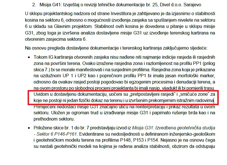 – Tokom IG kartiranja otvorenih zasjeka nisu nađene ni najmanje indicije rasjeda ili rasjednih zona na površini terena. Uvidom u dostavljenu dokumentaciju uočeni su „pretpostavljeni rasjedi“ i „smičuće zone“ za koje ne postoji ni jedan fizički dokaz na terenu i u izvršenim prekomjernim istražnim radovima. Nejasno je na osnovu čega su nastali geotehnički modeli na kojima je rađena analiza stabilnosti, s obzirom da odstupaju od inžinjersko-geoloških profila na kome nisu naznačeni tipovi stijenske mase (R0, R1, R2, R3) na koje se projektant misije G31 poziva. Netransparentan prikaz proračuna analize stabilnosti gdje se ne može utvrditi koji parametri su usvojeni za proračun stabilnosti. Promatrajući dostavljenu dokumentaciju misije G31, vidljiv je „ogroman“ uloženi trud, međutim, prikaz rezultata istraživanja u najmanju ruku nije standardiziran i kontradiktoran je dosadašnjim geološkim spoznajama i iskustvima – stoji, između ostalog, u nalazima profesora Šerifovića.