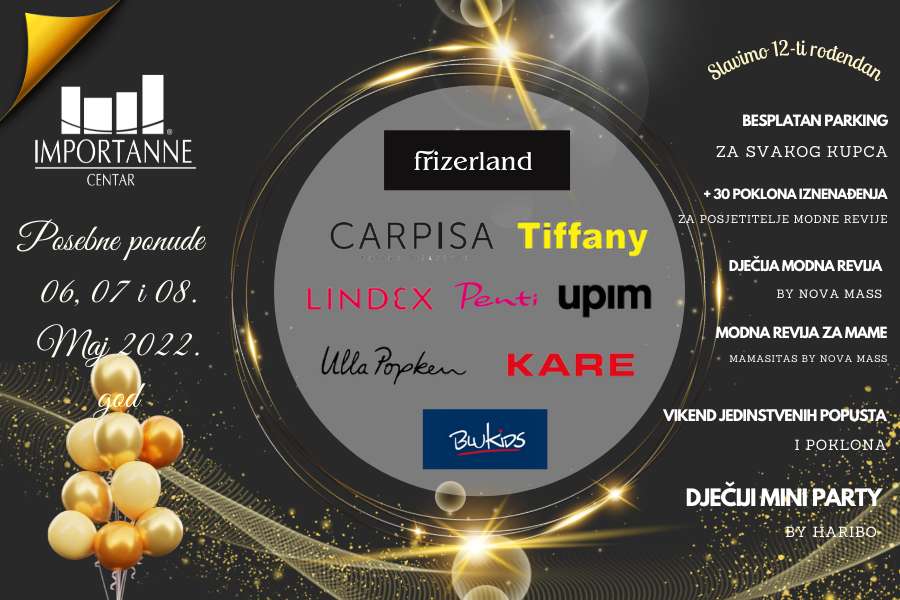Povodom 12. rođendana ne zaboravite da posjetite i druge brendove u Importanne centru i potražite posebne ponude u: VICKO BIH, Inoma concept Store-u , La donna & Alex Max Gerry Weber, Margo BIH, Hello Baby, Inn sport, Watch Line, Top Shop, Muscle Freak, Apoteke Sarajevo, Juice & smoothies, Uni-Expert, Univerzalno.com i Konzum Importanne – galerija okusa i CM Cosmetic Market!
