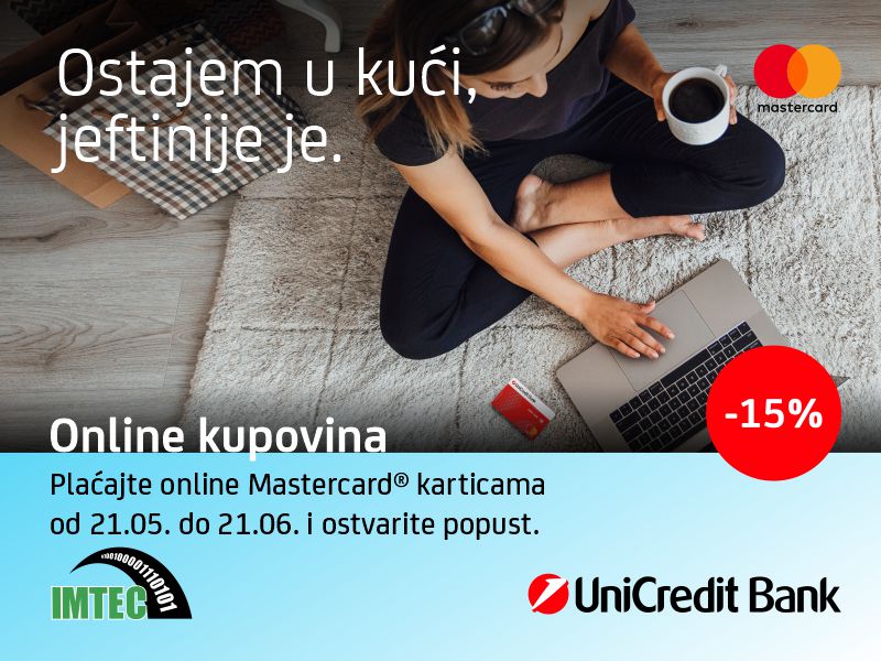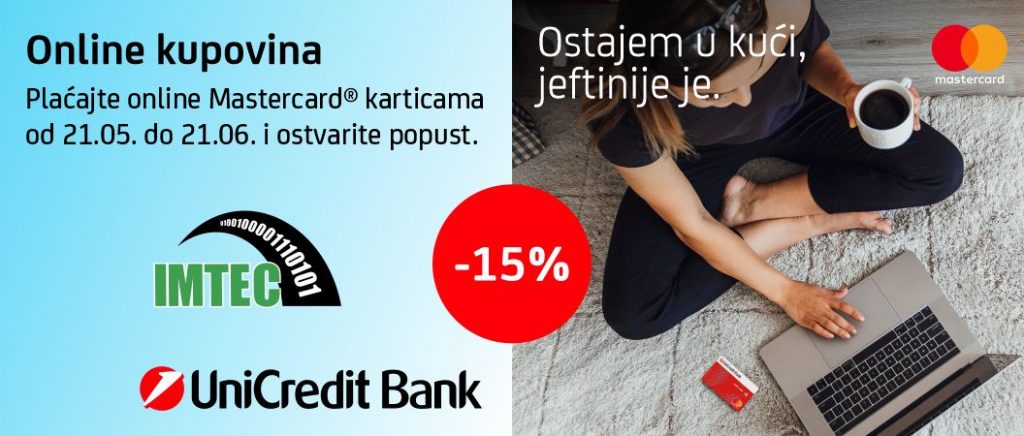 IMTEC i UniCredit Banka: 15% popusta na cijeli asortiman na IMTEC webshopu – Online kupovinom sa Mastercard karticama UniCredit Bank, iz udobnosti svoga doma, ostvarujete popust od 15% na IMTEC webshop-u na cijeli asortiman.
