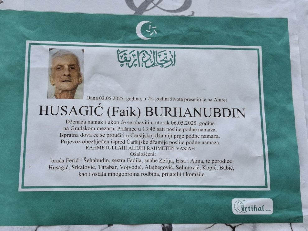Dženaza namaz i ukop će se obaviti danas, utorak, 06.05.2025. godine na Gradskom mezarju Prašnice u 13:45.