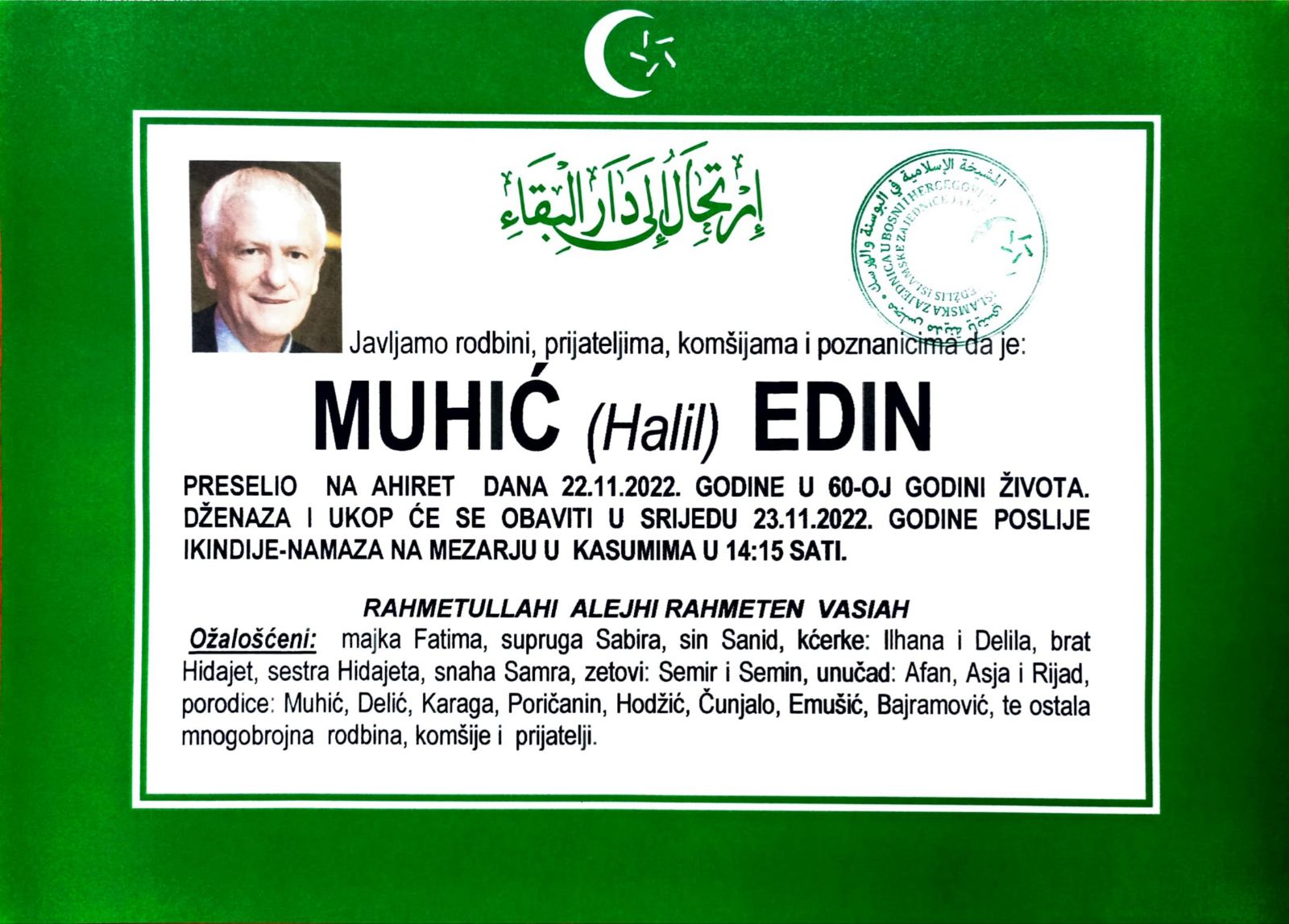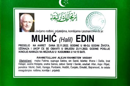 U utorak 22. novembra 2022. godine ili 27. rebiul-ahira 1444. hidžretske godine, u svojoj šezdesetoj godini na ahiret je preselio Edin Muhić, diplomirani inžinjer telekomunikacija i komunikacijskih tehnologija.