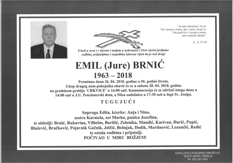 Iza Emila Brnića ostala je neutješna supruga Edita i kćerke Anja i Nina i sestra Karmela, zet Marko, punica Jozefina kao i mnogo ožalošćene rodbine , prijatelja i komšija.