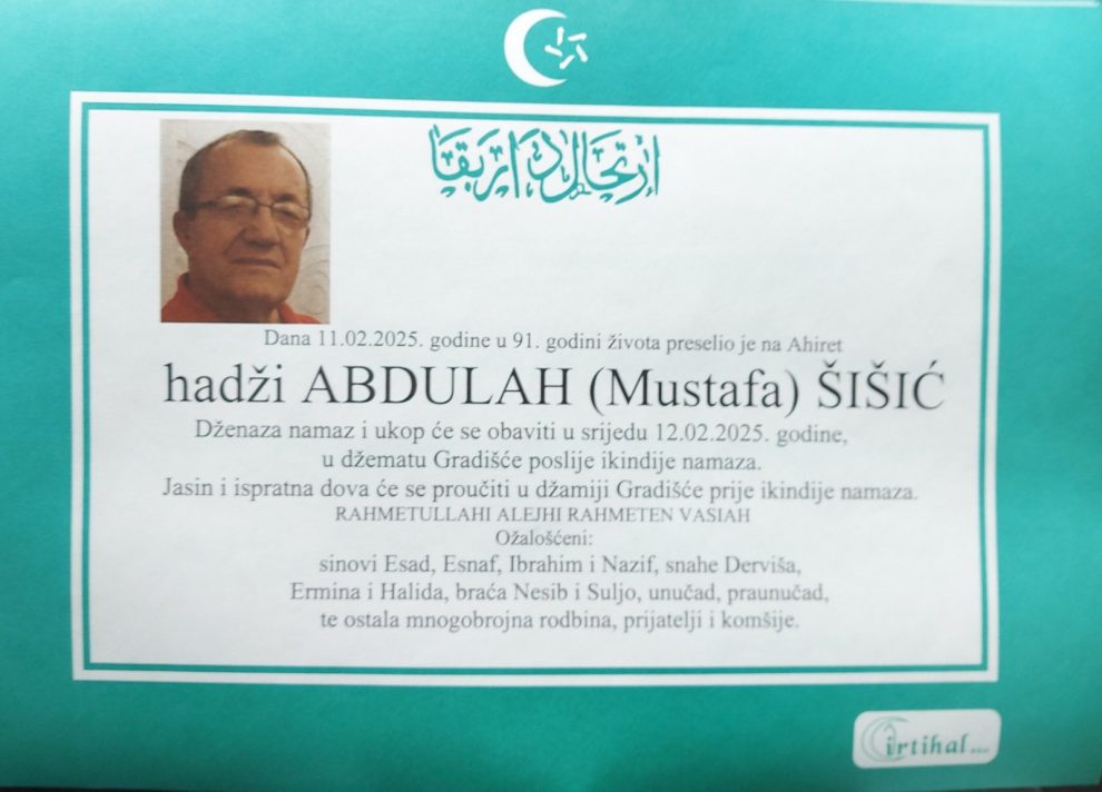 Danas smo obavješteni da je preminuo, da je na bolji Svijet preselio hadži Abdulah, u 91. godini.