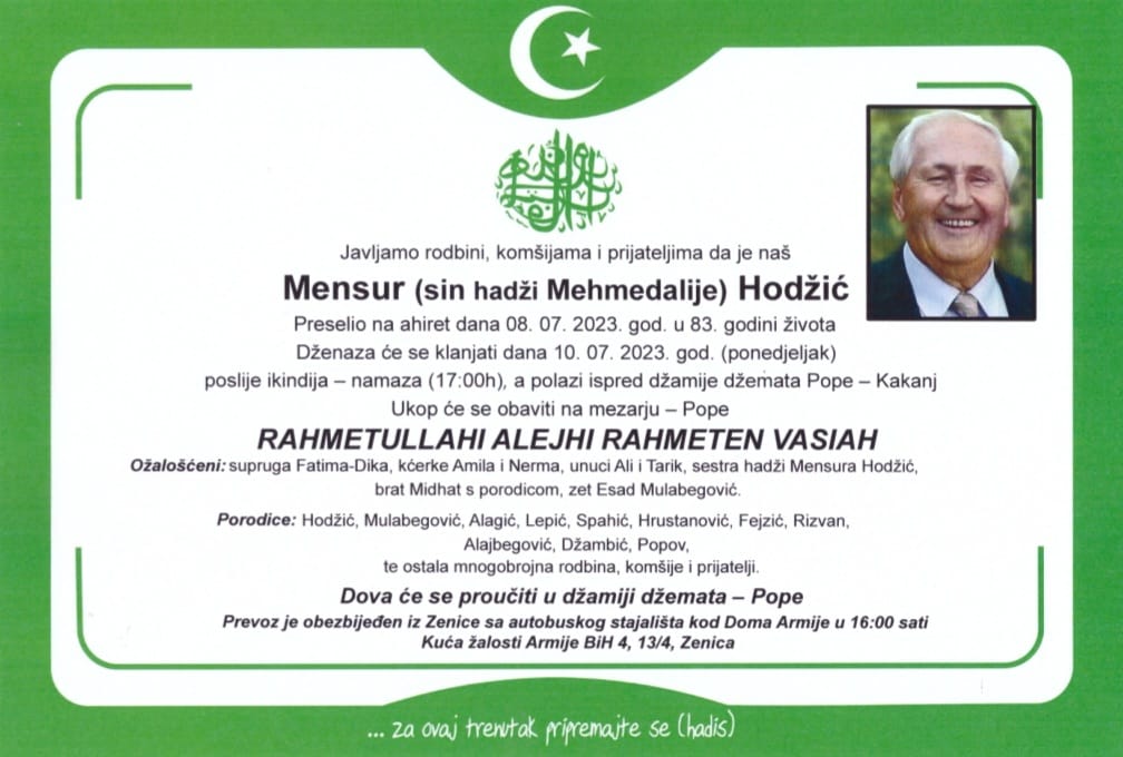 U Zenici je prije nekoliko dana preminuo Mensur (sin hadži Mehmedalije) Hodžić, u 83. godini života. Dugogodišnji zenički advokat, dijelu sugrađana poznat i kao strastveni radioamater. Sahranjen je na mezarju Pope u Kaknju, u ponedjeljak. Iza njega su ostali supruga Fatima-Dika, kćerke Amila i Nerma, unuci Ali i Tarik, sestra hadži Mensura Hodžić, brat Midhat sa porodicom…