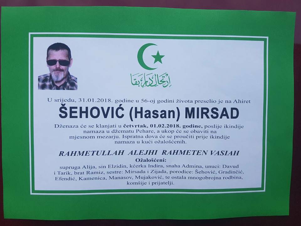 IN MEMORIAM: Mirsad Šehović – Šeha – Dok je ezan sa minareta u Peharama sljedbenike islama pozivao na sabah, jutros je našem Batoncu, teškom RVI, Mirsadu Šehiću-Šehi značio poziv na ahiret. Mirsad Šehović- Šeha je nakon duge i teške bolesti, preselio na ahiret. Na onaj ljepši, pravedniji, i iskreniji svijet, od ovog kojim hodimo do volje Uzvišenog. Svijet, u kojem ne vlada pohlepa i razvrat kao mjera prestiža ovoga svijeta. Svijet u kojem se kap prolivene krvi gazije, prolivene za svoju domovinu, vrednuje više nego svo bogatstvo ovoga svijeta.