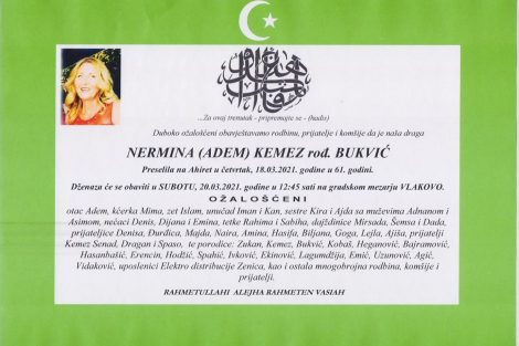 Odlazi nam draga raja… Godine sedamdesete, osamdesete, lijepo življenje u našoj Zenici, još ljepša raja sa kojom se družimo, ali eto, polako nas napušta ta naša lijepa, dobra raja. Danas nas je, u svojoj šezdesetoj godini zauvijek napustila naša sugrađanka, naša raja sa igranki, korza, muzičkih i dramskih predstava, Nermina Kemez – Mina. Svojim vedrim duhom, drugarstvom i srčanošću, falit će ovom gradu kao neko ko je dao svoj veliki doprinos njegovom bivstvovanju kao grada, Grada Zenice. Spominjati će je u lijepom sjećanju njeni najbliži, kćerka Mima, zet Islam, sestre, muž, koji će njenom unuku Kanu i unuki Iman imati mnogo godina pričati o njihovoj majki, neni Mini…Neka je vječni rahmet njenoj duši, napisao je naš saradnik Ibrahim Emić.