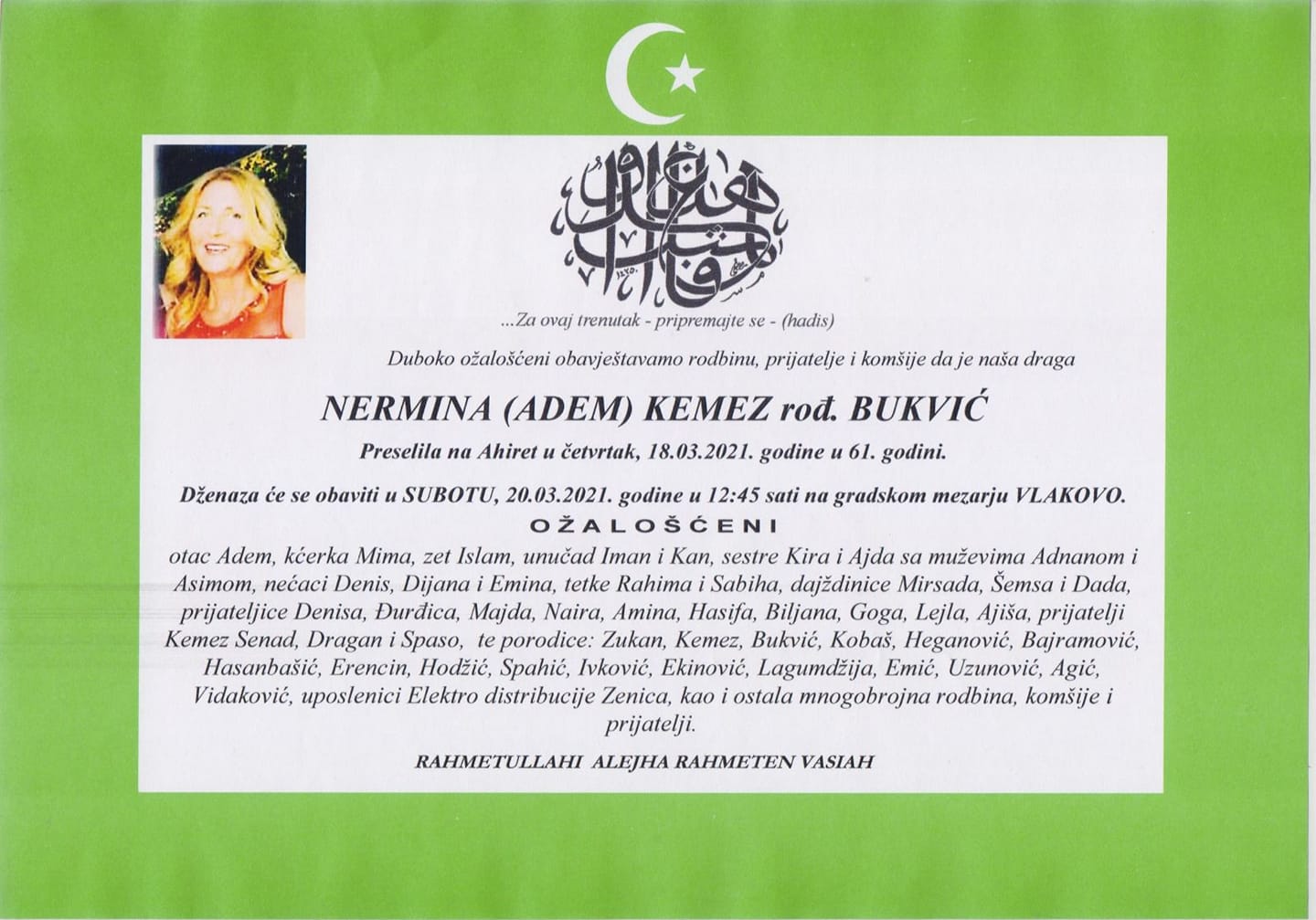 Sutra ću objaviti detalje dzenaze, napisala je Mima Kemez.