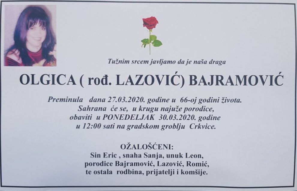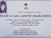 Zauvijek nas je napustila naša sugrađanka Olgica Bajramović (rođ.Lazović). Preminula je u 66.godini, nakon duge borbe sa opakom bolešću. Njena sahrana će, u krugu najuže porodice, biti obavljena na Gradskom groblju Crkvice, u ponedjeljak 30. marta u 12 sati.