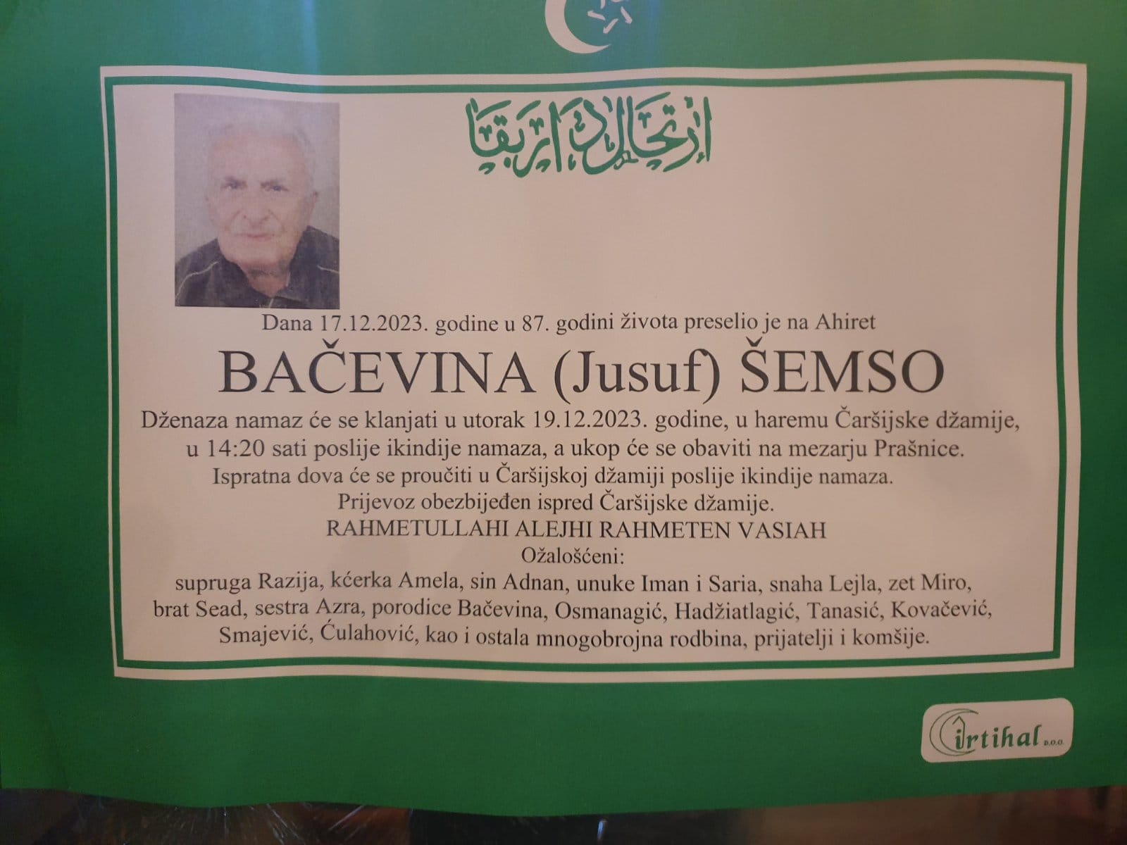 Šemso (Jusufa) Bačevina rođen 1936. godine preminuo je 17.12. 2023. godine u Zenici.
