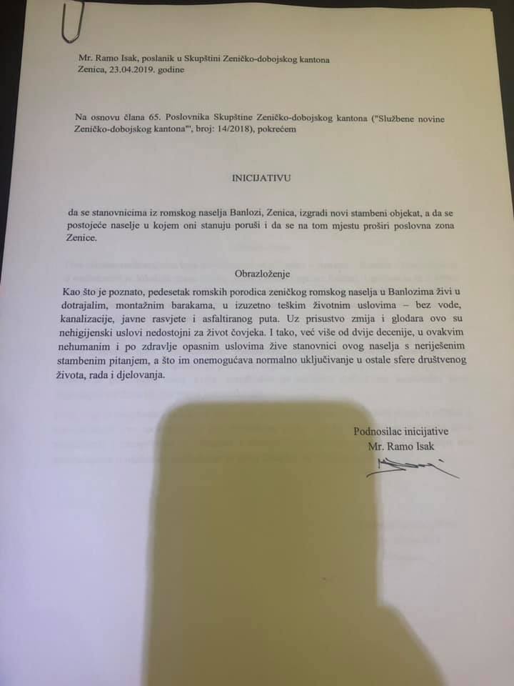 Ovom incijativom poslanik Ramo Isak direktno u rješavanje ovoga problema uključuje institucije i organe uprave Zeničko-Dobojskog kantona, za koje Udruženje nacionalnih manjina iz Zenice ni najmanje ne sumnja da posjeduju sve potrebne kapacitete za rješavanje ovoga dugogodišnjeg problema romske zajednice sa područja grada Zenice.