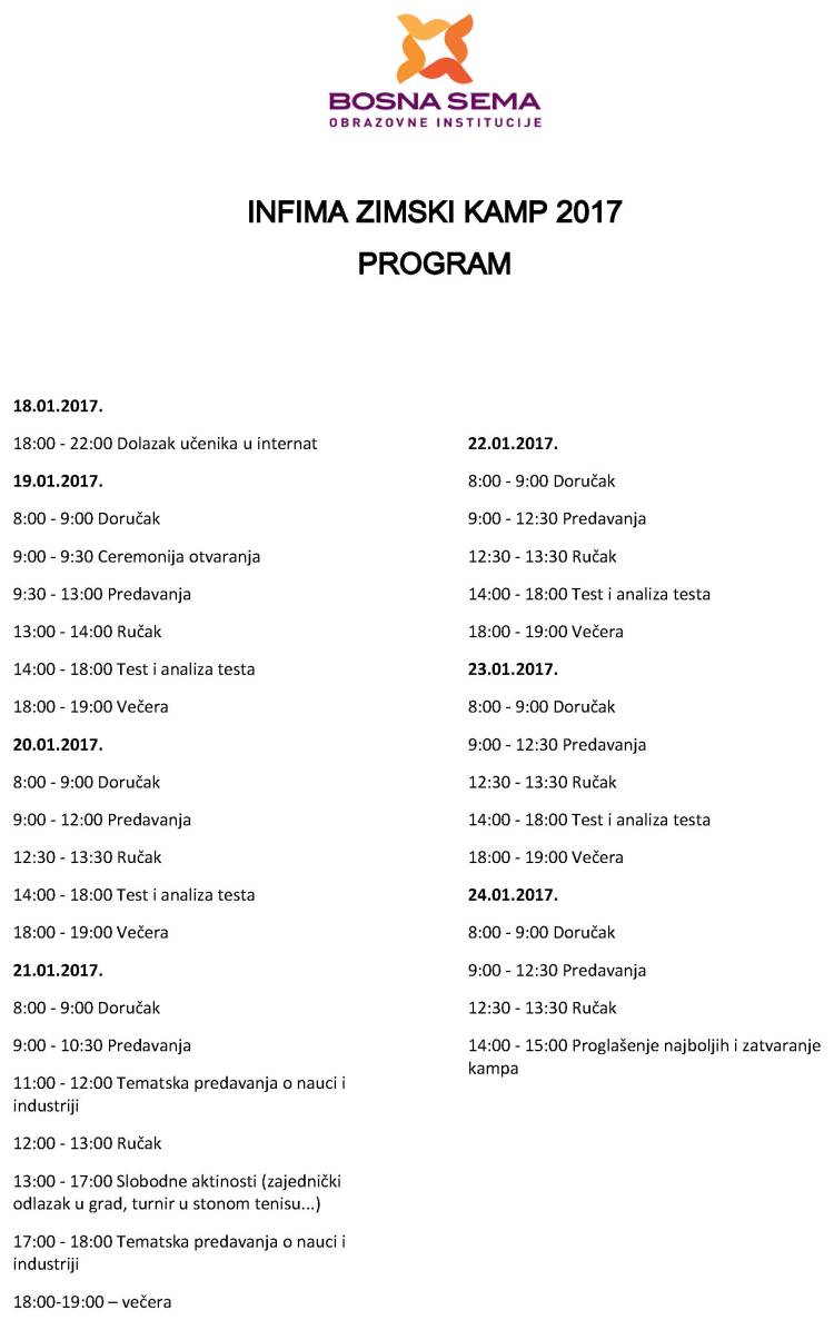 INFIMA kamp će se održati u periodu od 18. do 24. januara 2017. godine u prostorijama Međunarodne srednje škole u Sarajevu. Tokom kampa, sa učenicima će raditi bivši svjetski olimpijci i pobjednici na brojnim međunarodnim takmičenjima. Pored toga, ove godine, upriličena će biti i predavanja od strane vrhunskih stručnjaka iz prirodnih nauka i IT industrije.