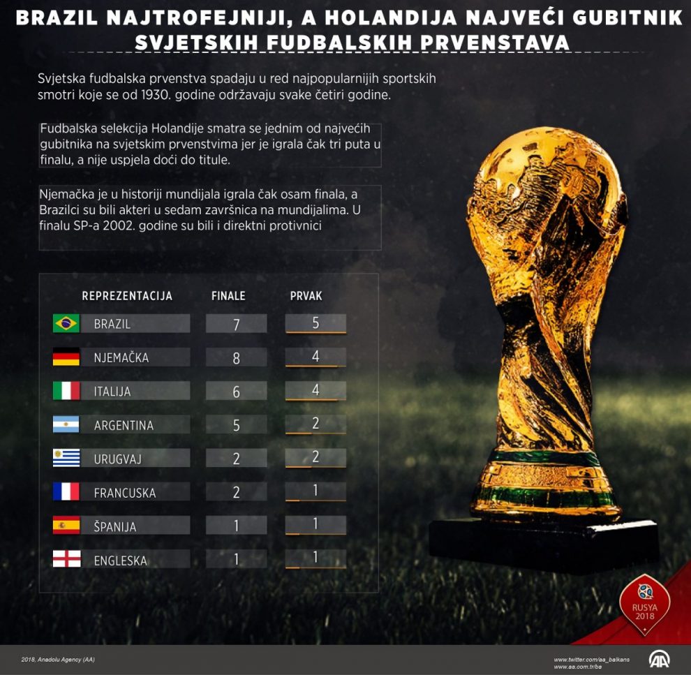 INFOGRAFIKA: Brazil najtrofejniji, Holandija najveći gubitnik svjetskih prvenstava u nogometu – Izuzevši period Drugog svjetskog rata, do sada je odigrano ukupno 20 mundijala, a najtrofejnija nacija je Brazil koja se u pet navrata okitila titulom prvaka svijeta.
