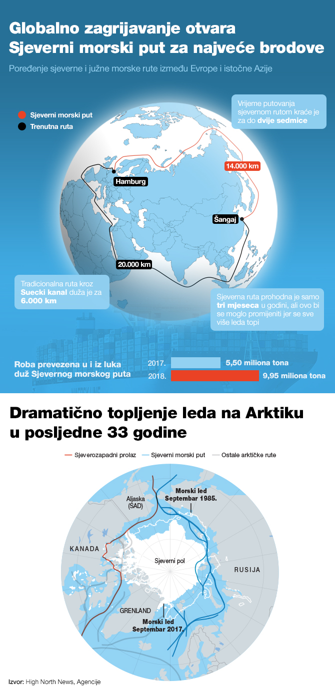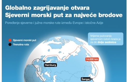 Infografika: Globalno zagrijavanje otvara Sjeverni morski put – Plovidba sjevernom pomorskom rutom kraća je za do dvije sedmice i šest hiljada kilometara.