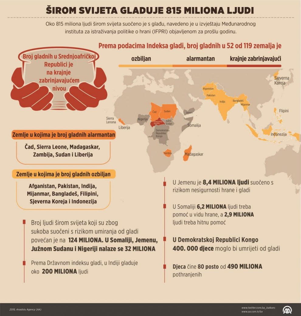 INFOGRAFIKA – Širom svijeta gladuje 815 miliona ljudi – Oko 815 miliona ljudi širom svijeta suočeno je s glađu, pokazuje nova infografika novinske agencije Anadolija napravljena na osnovu podataka Međunarodnog instituta za istraživanja politike o hrani. U posljednjem izvještaju “Globalni indeks gladi”, kojeg je za 2017. godinu objavio Međunarodni institut za istraživanja politike o hrani (IFPRI), navodi se kako je u 52 od 119 obuhvaćenih zemalja svijeta, broj gladnih na “ozbiljnom”, “alarmantnom” ili “krajnje zabrinjavajućijem” nivou.