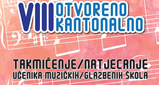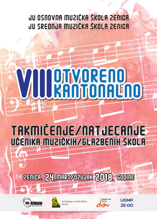 Obavještavamo vas da će u subotu, 24.03.2018.godine u prostorijama JU Srednja muzička škola i JU Osnovna muzička škola Zenica biti održano VIII Otvoreno kantonalno takmičenje muzičkih/ glazbenih škola. Svečano otvorenje takmičenja je u 10,00 h u sali Srednje muzičke škole.