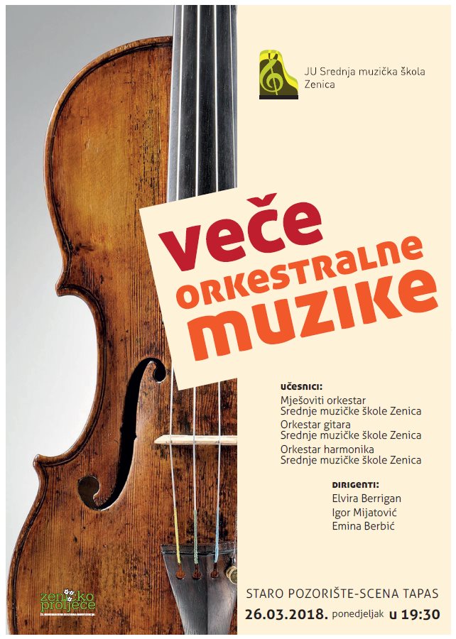 U okviru manifestacije Zeničko proljeće održat će se koncert orkestralne muzike u starom pozorištu ( Tapas ) u ponedjeljak, 26.03.2018.godine sa početkom u 19,30 h.