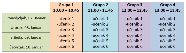 Druženje traje četiri dana, svaki dan je na programu jedan čas od 45 minuta. Ciklus će se ponoviti tri puta u toku januara. U prvoj sedmici januara na raspolaganju su mjesta u četiri grupe a raspored je prikazan na slici ispod