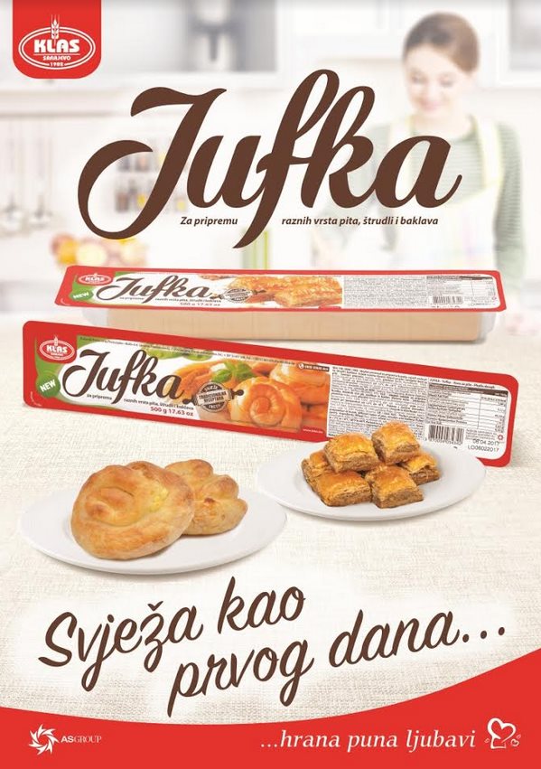 (Sarajevo, 23.02.2017.) – Prehrambena industrija Klas d.d. Sarajevo na tržište je plasirala Jufku za pripremu raznih pita, štrudli i baklava prema novoj, originalnoj recepturi i u inovativnom pakovanju. Riječ je o čvrstoj posudi koja jufku štiti od lomljenja i isušivanja, te tako osigurava svježinu proizvoda kao i prvog dana.