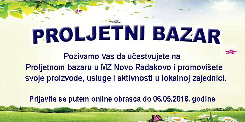 Pozivamo sve nevladine organizacije, kulturno-umjetnička društva,  pojedince, i sve one koji se bave nekim zanimljivim aktivnostima i rade korisno za lokalnu zajednicu da se prijave na Proljetni Bazar.