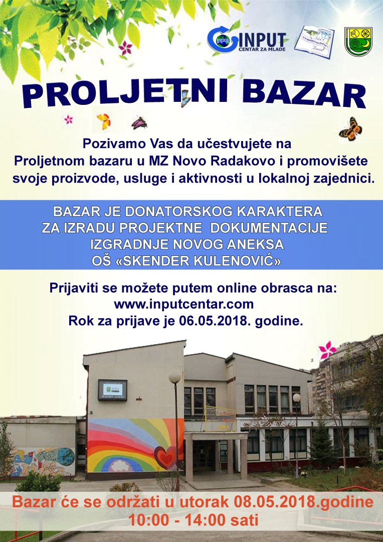 INPUT: Proljetni bazar 8. maja od 10h do 14h – Centar za mlade INPUT, Vijeće učenika, Vijeće roditelja i uposlenici OŠ “Skender Kulenović” organizuju PROLJETNI BAZAR. Bazar je donatorskog karaktera prikupljena sredstva biće usmjerena na izradu projektne dokumentacije novog aneksa Osnovne škole “Skender Kulenović”. Učenici i nastavnici OŠ “Skender Kulenović” su uvidjeli problem u nedostatku učionica i normalnom održavanju nastave, te su se odlučili aktivirati i pokrenuti zajedno sa nevladinim sektorm i lokalnom zajednicom. Bazarom se želi uvezati nevladin sektor, škola i mjesne zajednice, uključiti mještane u aktivnosti za poboljšanje uslova življenja u lokalnoj zajednici i umrežavanja lokalnih resursa.