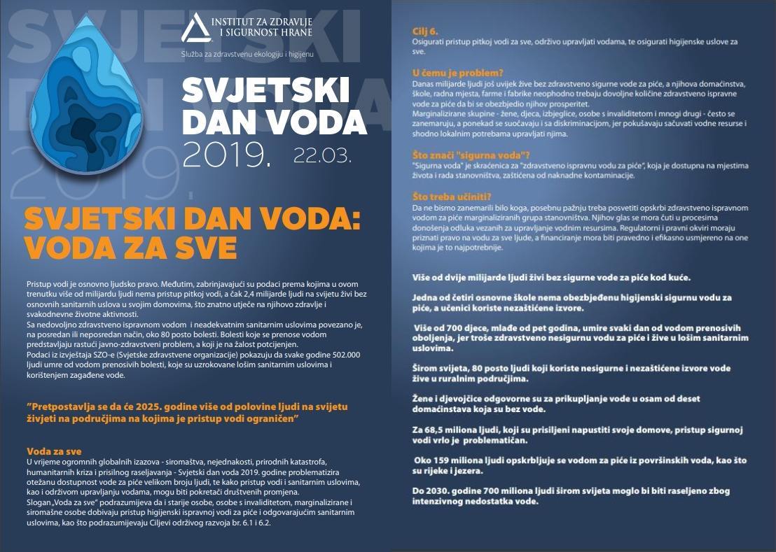 Institut za zdravlje i sigurnost hrane Zenica i njegova Služba za zdravstvenu ekologiju i higijenu tradicionalno obilježavaju Međunarodni Dan voda seminarom, čija tema ove godine je bila “Zdravstveni rizici dvojnog napajanja kućnih vodovodnih instalacija”.