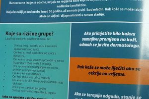 – Svi pregledani će dobiti zdravstveno promotivni materijal sa detaljnim informacijama o faktorima rizika za pojavu karcinoma kože, samopregledu – na koje promjene treba obratiti pažnju, preventivnim mjerama zaštite kao i pravilnom korištenju preparata za zaštitu od sunca i na poklon simbolično pakovanje preparata za zaštitu od sunca. Cilj ove kampanje jeste edukacija šire javnosti o opasnostima nepromišljenog ponašanja na suncu, štetnim posljedicama pretjeranog izlaganja UV zračenju na zdravlje, pravilnim načinima zaštite od UV zračenja te važnosti samopregleda mladeža, ističe dr. spec. Elma Kuduzović, rukovoditeljica Odjeljenja za promociju zdravlja u INZ-u.