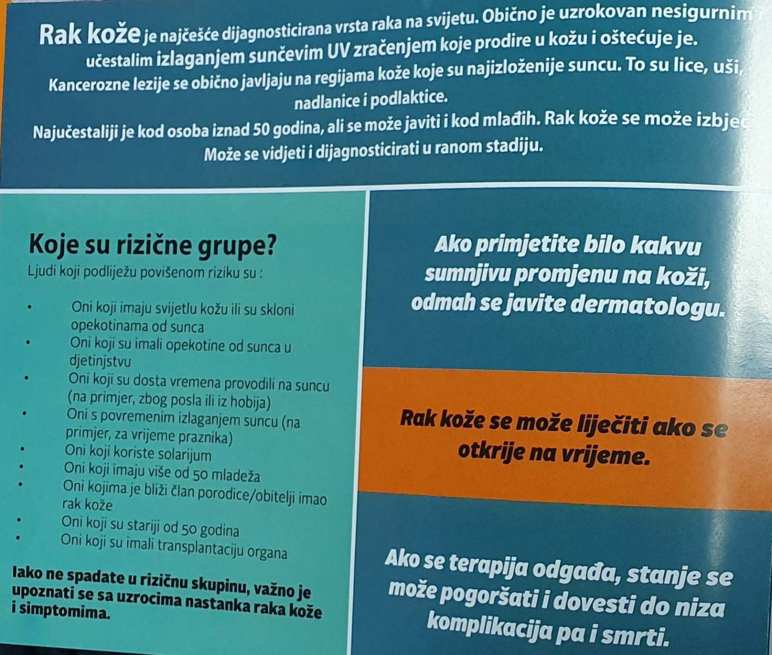 – Borba protiv raka kože počinje u našoj svijesti spoznajom da rizik postoji. Cilj kampanje je osvješćivanje javnosti o karcinomu kože kao i lakom i besplatnom načinu otkrivanja sumnjivih lezija u najranijem stadiju. Kampanja takođe ima za cilj edukaciju šire javnosti o opasnostima nepromišljenog ponašanja na suncu, štetnim posljedicama pretjeranog izlaganja UV zračenju na zdravlje, kao i pravilnim načinima zaštite od UV zračenja te važnosti samopregleda mladeža, posebno kad se uzme u obzir da pravovremenim otkrivanjem melanoma izlječivost gotovo 100 posto, istakla je dr. Kuduzović.