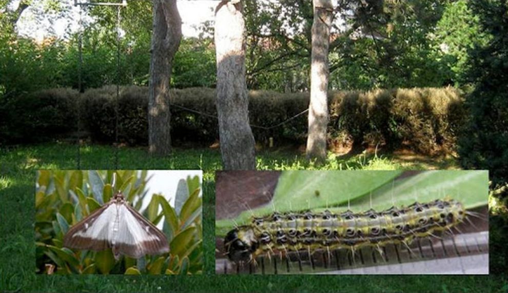 U početku na donjim dijelovima grma i u njegovoj unutrašnjosti, a kada je šteta postala vidljiva na vanjskim dijelovima, je detektovan kao “Šimširov moljac” (Cydalima perspectalis) porijeklom iz Azije (Kina, Koreja i Japan), a u Evropi je prvi put evidentiran u Njemačkoj 2006. godine u rasadniku koji se nalazi u blizini granice sa Švicarskom, najvjerovatnije unesen sadnicama šimšira iz Kine. Štetnik se vrlo brzo proširio po velikom dijelu Europe, u Austriji, Švicarskoj, Nizozemskoj, Francuskoj, Italiji, Velikoj Britaniji, Belgiji, Mađarskoj i Sloveniji, a migracijom i letom odraslih oblika, stigao je do Bosne i Hercegovine.