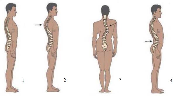 Najčešći deformiteti lokomotornog sistema su kifoza (pogrbljenost), skolioza (krivljenje kičme u stranu), te lordoza (prenaglašena krivina u slabinskom dijelu). Pogrbljenost javlja kao povećana krivina kičmenog stuba u grudnom dijelu, ali i drugim dijelovima kičme, dok krivljenje kičme u stranu se karakteriše pojavom asimetrije na tijelu (ramena nisu u istom nivou, jedna lopatica izraženija od druge, neravnomjerni struk, jedan kuk viši od drugog). Lordozu pak karakteriše veliki jaz između slabinskog dijela leđa i poda kada osoba leži na leđima na čvrstoj površini, te bol u leđima, nelagodnost i problemi u kretanju.