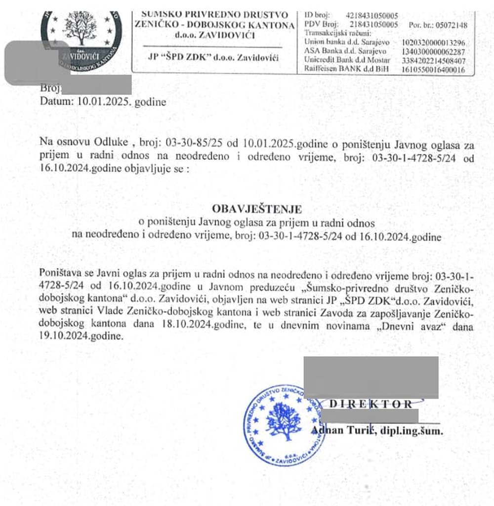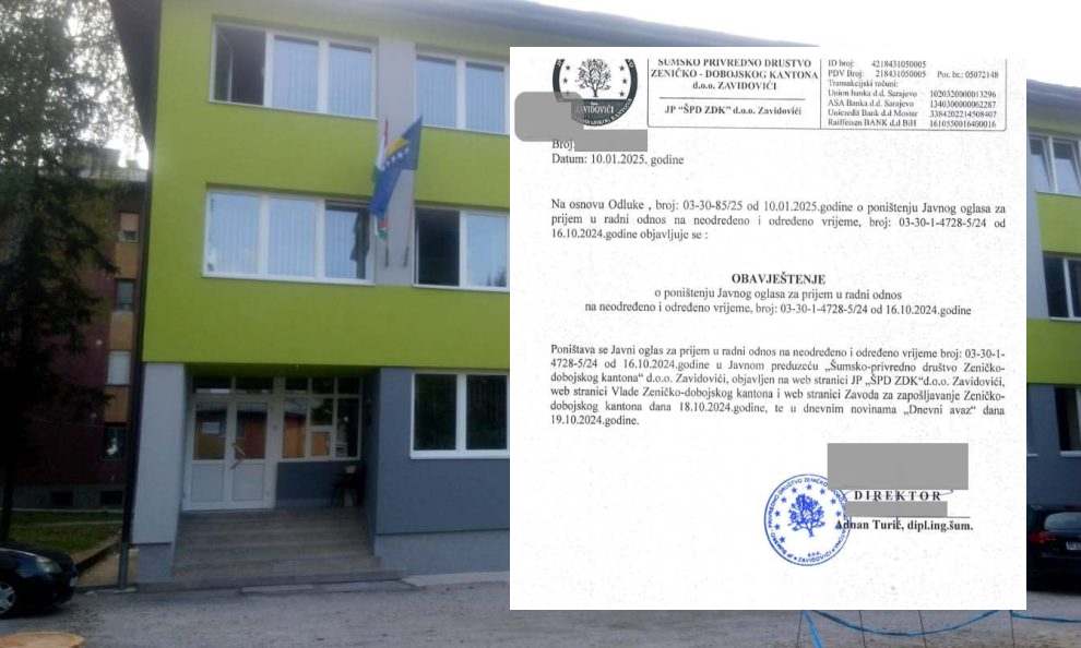 Kako ekskluzivno saznaje Zenicablog, direktor Šumsko-privrednog društva Zeničko-dobojskog kantona (ŠPD ZDK) Adnan Turić ispoštovao je večeras sinoć donesen Zaključak Nadzornog odbora ove firme, kojim se upravi ŠPD-a i njemu lično nalaže poništavanje Javnog konkursa za prijem četrdeset (40) zaposlenika, raspisan u oktobru prošle godine.