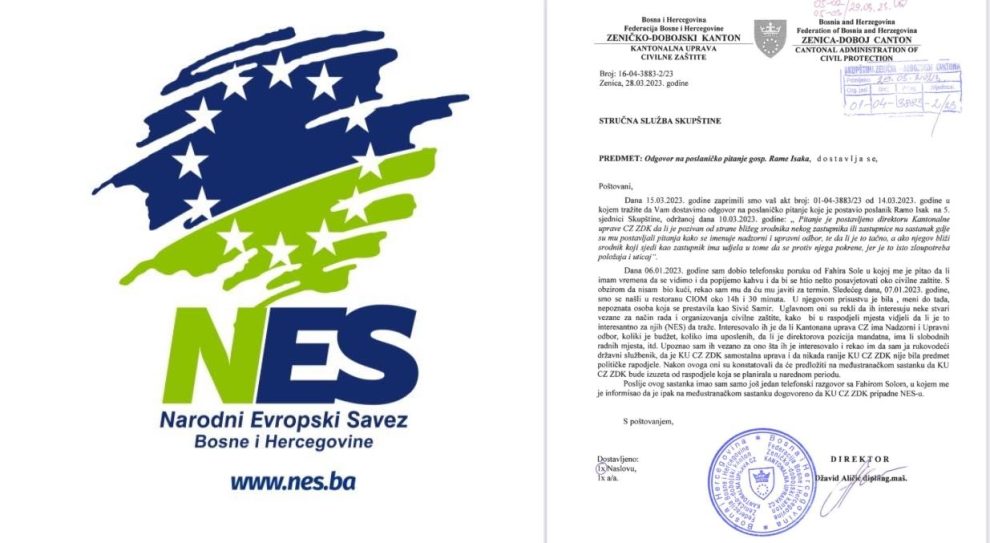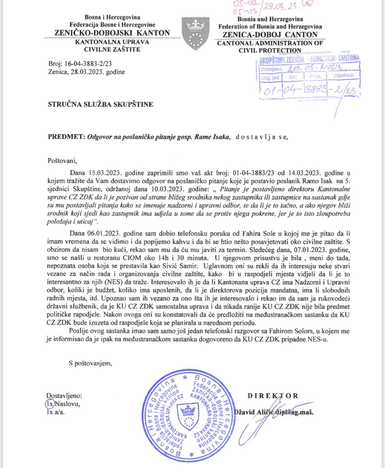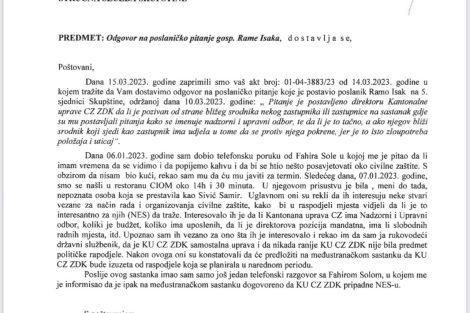 Cijenjeni građani, na protekloj 5. sjednici Skupštine ZDK postavio sam poslaničko pitanje, a sve tragom informacija koje sam dobio, direktoru Kantonalne uprave civilne zaštite ZDK, da li je bio kontaktiran i pozivan od strane bližeg srodnika zastupnice na sastanak, gdje su mu postavljana pitanja koja bi mogla izazvati zloupotrebu položaja i utjecaja.