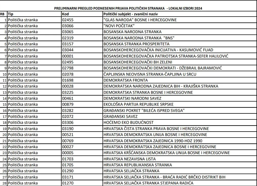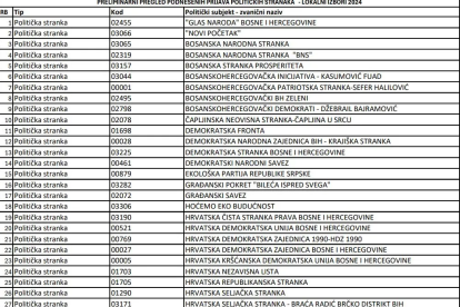 Preliminarni pregled podnesenih prijava objavila je danas Centralna izborna komisija (CIK) Bosne i Hercegovine, po isteku roka za prijave.