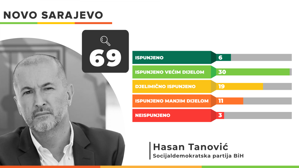Od 69 obećanja načelnika Općine Novo Sarajevo Hasana Tanovića u potpunosti ih je ispunjeno 6, a većim dijelom 30. Djelimično je ispunjeno 19 obećanja, dok ih je 11 ispunjeno manjim dijelom.